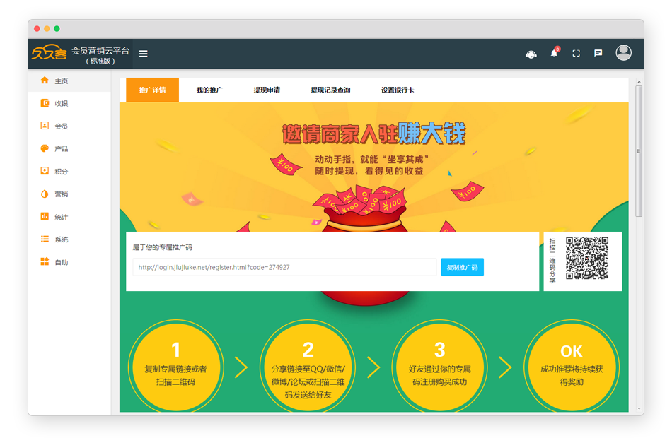 向他人推荐本软件,他人使用注册成功并消费后,推荐人即可获得相应金额奖励,轻松赚钱。