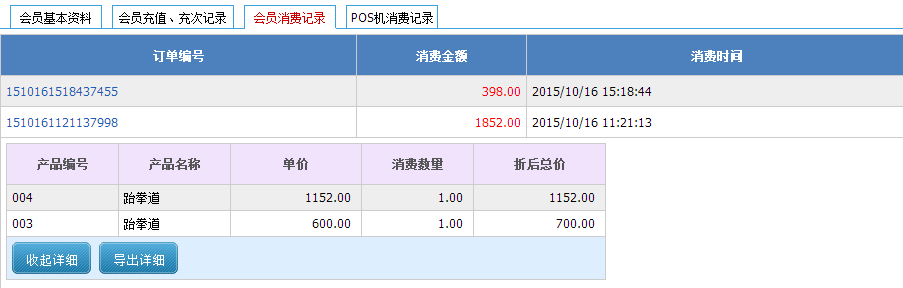 和问题2的差不多,依次点击“会员管理”-“会员列表”-对应会员的“卡号”-“会员消费记录”-“订单编号”