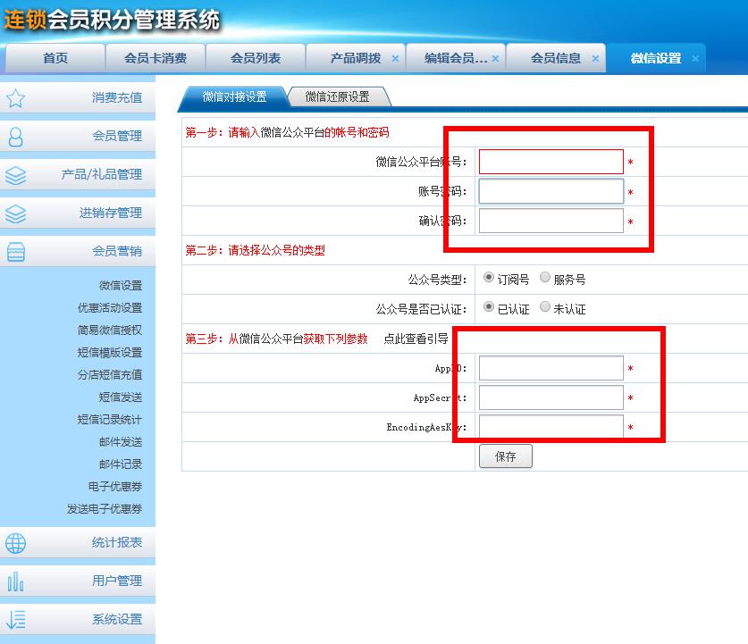 在万泰注册软件微信设置页面,填入商公众号相关信息,即可绑定实现微信端功能。