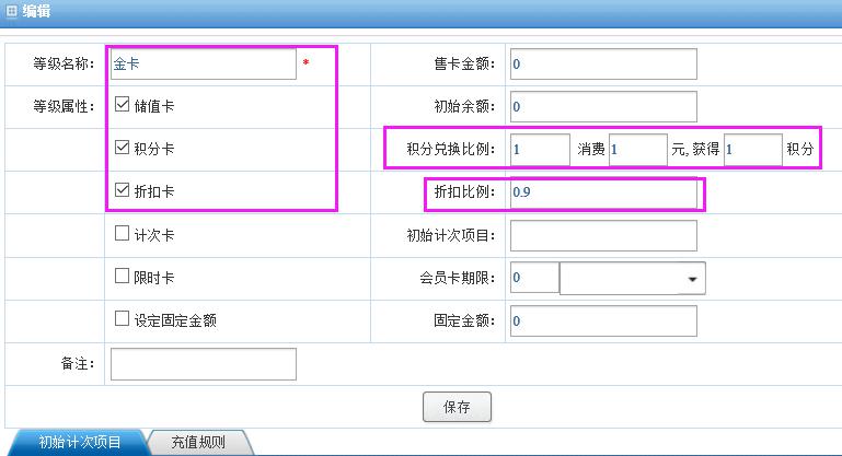 1.先我们需要将普通客户当做会员,正常录入到系统中,这里需要设置两个或者更多个会员别来区分消费者的实际身份,不享受折扣的会员只需要勾选积分功能即可,其他选项可不填。