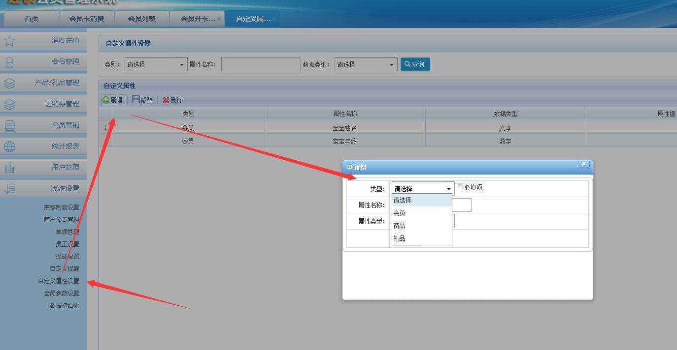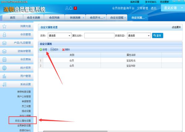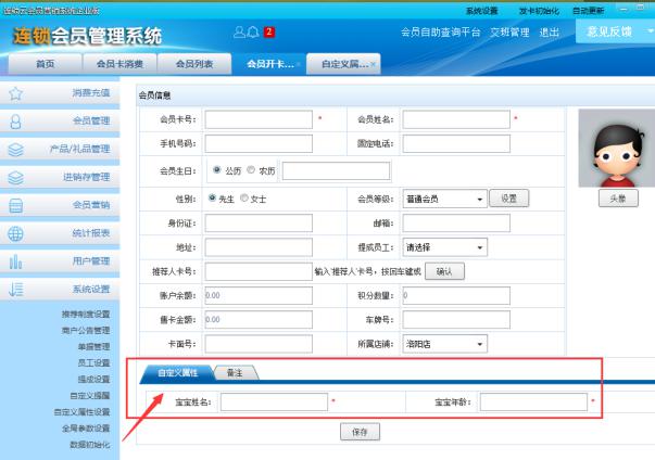 会员可以通过系统设置——自定义属性设置——添加自定义属性。软件里面会员可以通过添加会员自定义属性去新增信息栏,例如宝宝姓名,年龄。