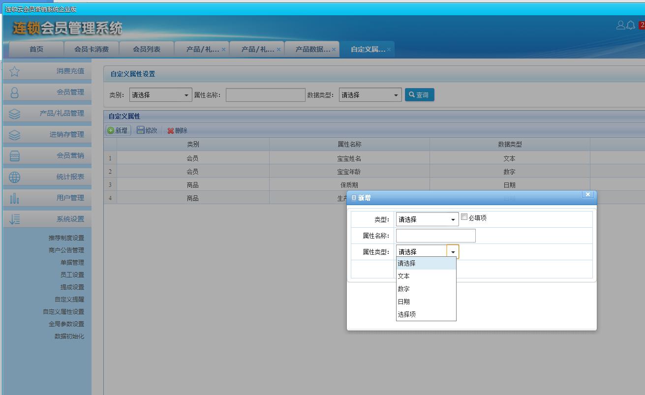 那么自定义属性可以对会员、商品、礼品这些类型去做自定义编辑添加,也可以选择是否是必填项,倘若设置一必填项,客户在登记的时候没有填写该信息就无法注册成一会员,同时这里添加了这些自定义属性之后,如果不需要了也可以对该属性进行修改或者是删除,相对来说方式也是很灵活的。