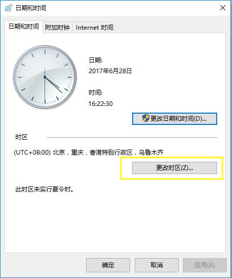 打开控制面板,选择时间和日期,然后点击更改失去,改成图示的东八区即可。