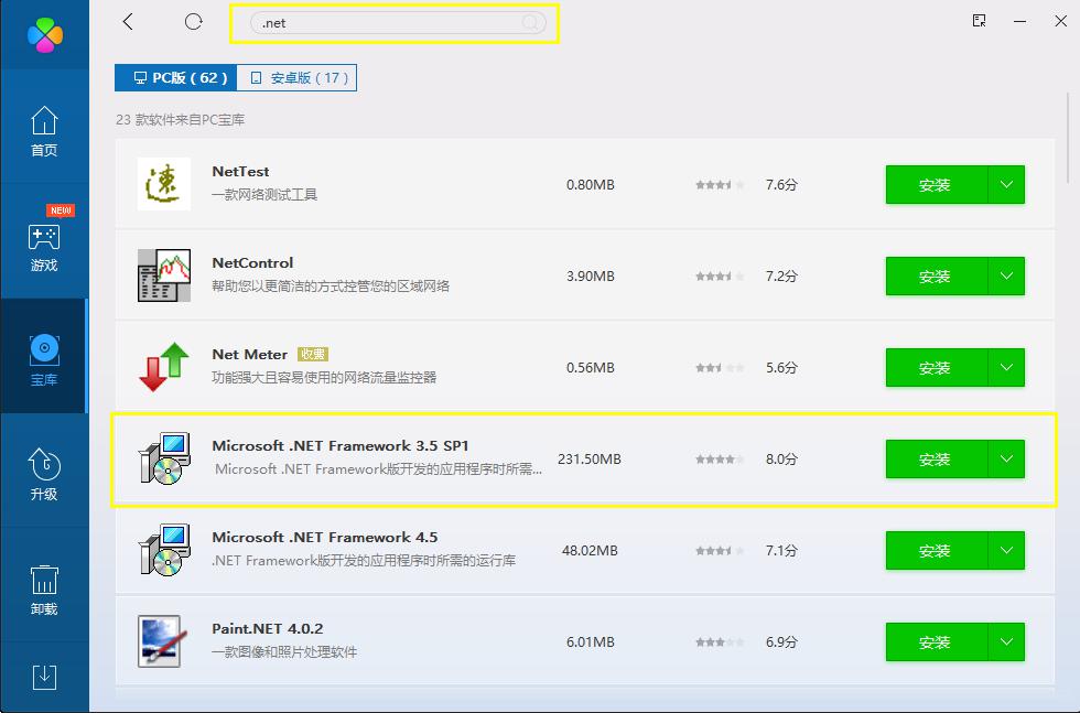 然后搜索“.NET”,然后由于万泰注册软件单机版本需要的是.NET 3.5的支持,所以选择Microsoft .NET Framework 3.5安装即可。