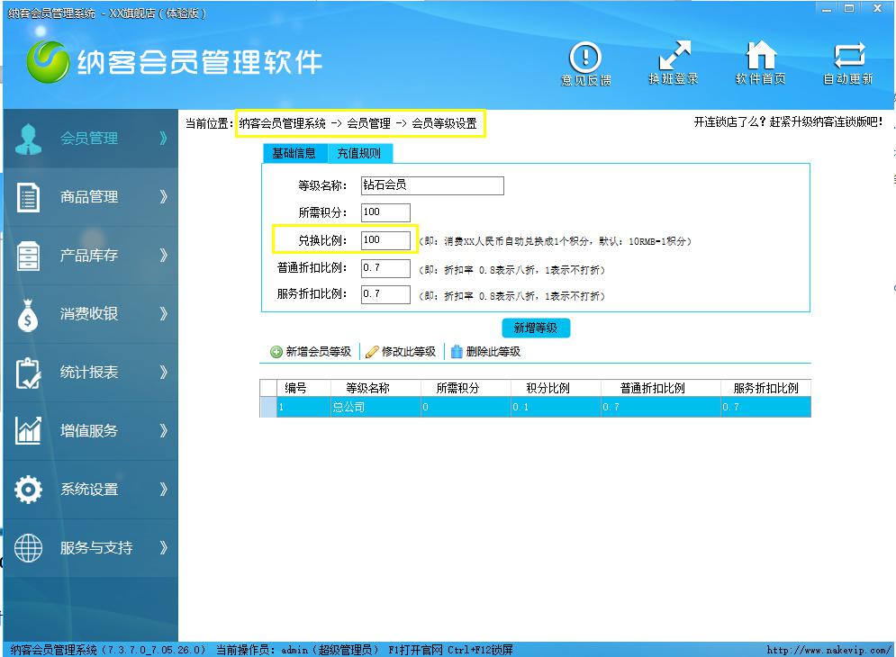 进入会员管理模块的会员等功能,然后在兑换比例处输入100,完成等新增。然后在新增会员时选择这个会员等,即可实现以上需求。